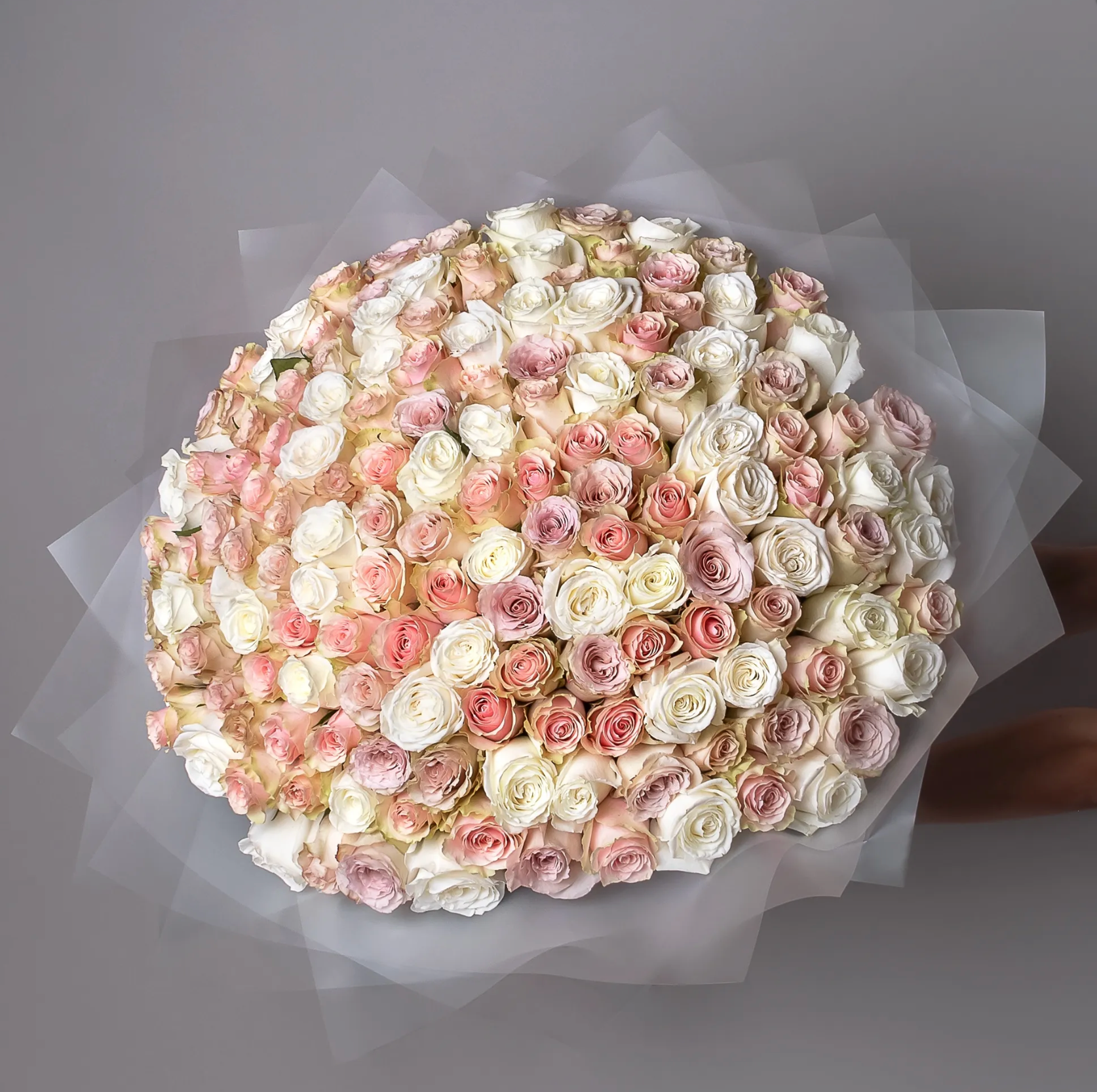 Voluminöser Monostrauß aus 150 Rosen in pastellfarbenen Tönen. Ein Strauß für diejenigen, die es lieben, zu überraschen und ihre Gefühle laut zu verkünden. Ein perfektes Geschenk für jeden großartigen Anlass.