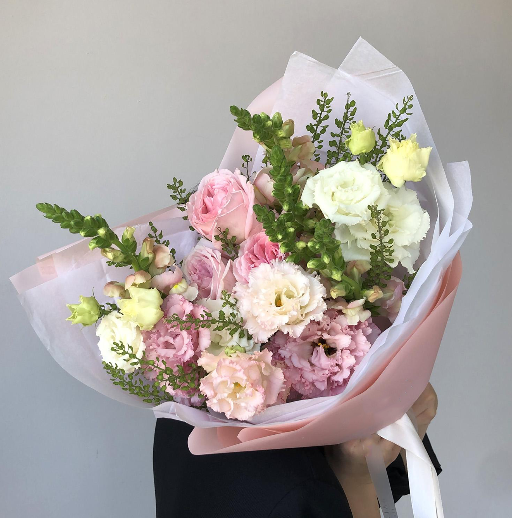 Ein zarter, luftiger Blumenstrauß mit üppigen Eustoma, pfingstrosenartigen Rosen und Löwenmäulchen – eine unglaublich schöne saisonale Kombination! Er wird jedes Interieur schmücken und der Empfängerin viele angenehme Emotionen schenken.