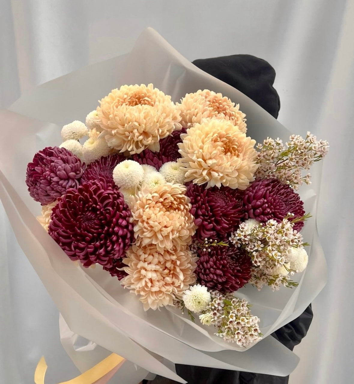 In diesem Bouquet sind Blumen in einer raffinierten und zarten Farbpalette zusammengestellt. Den Hauptteil bilden große Chrysanthemen in zwei Farbtönen: satte Bordeauxrote und zarte Cremefarbene. Ihre üppigen, vielschichtigen Blütenblätter verleihen dem Bouquet Volumen und Textur. Zwischen den Chrysanthemen befinden sich weiße kugelförmige Blüten (ähnlich wie weiße Pompons oder Schleierkraut), die Leichtigkeit und Luftigkeit bringen. Am Rand sind kleine Zweige von Waxflower mit winzigen weißen Blüten und grünem Laub platziert, die dem Bouquet zusätzliche Natürlichkeit und Eleganz verleihen.