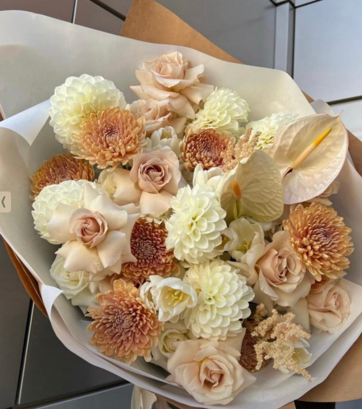 Dieser Strauß strahlt dezente Eleganz und zeitlose Schönheit aus. Die zarten Creme- und Beigetöne der Rosen, Chrysanthemen und Dahlien harmonieren perfekt mit den exotischen Anthurien und der leichten Astilbe. Der Strauß ist ideal für besondere Anlässe oder als edles Geschenk, das einen warmen, sanften und dennoch luxuriösen Eindruck hinterlässt.