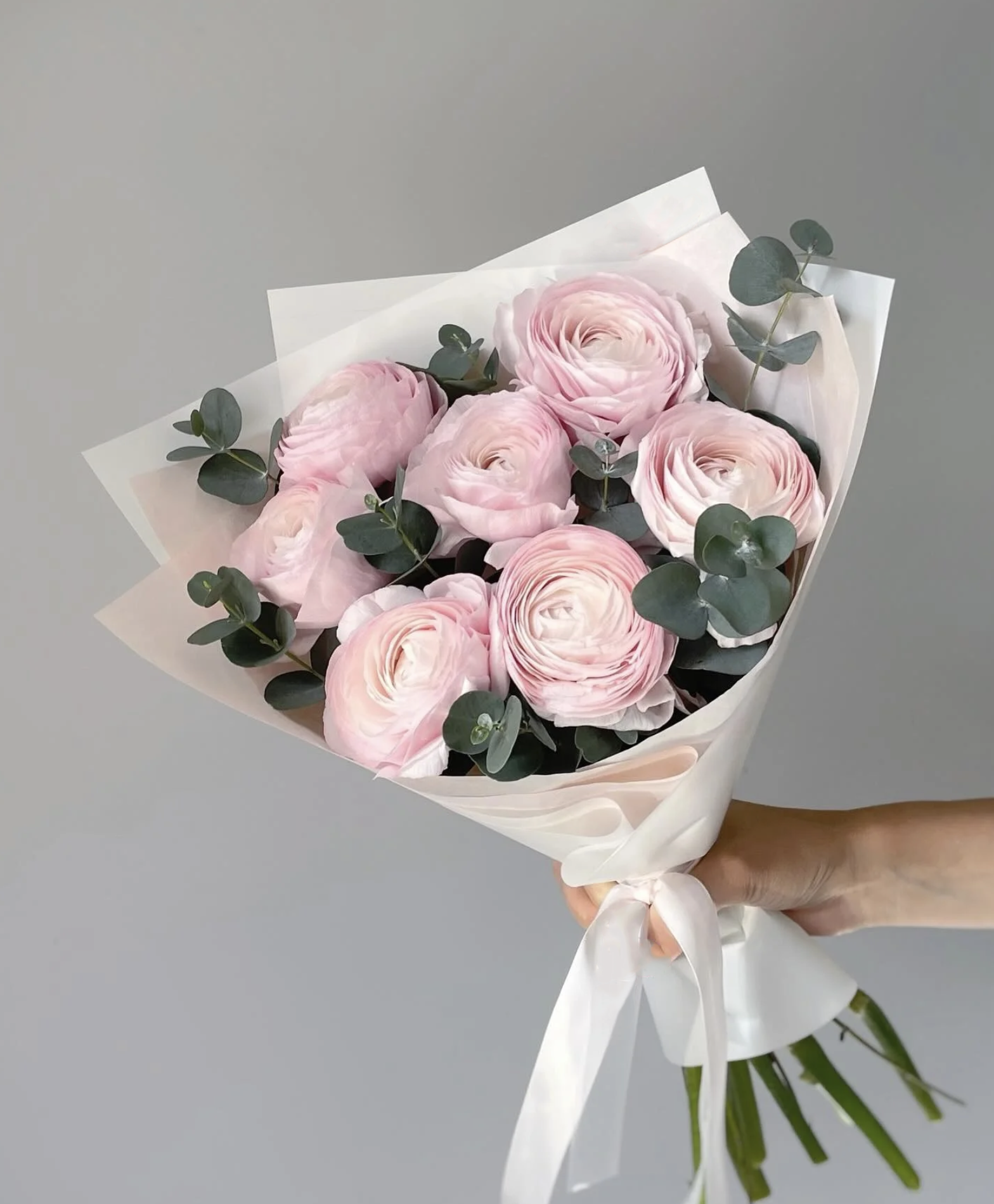 Ein bezauberndes Bouquet aus 7 eleganten Ranunkeln, umrahmt von frischem, aromatischem Eukalyptus. Die Kombination aus den sanften Blüten und dem lebendigen Grün verleiht dem Arrangement eine zeitlose Anmut und Leichtigkeit. Dieses Bouquet bringt die Frische und Eleganz des Frühlings in jeden Raum – perfekt, um Freude und Zuneigung zu schenken. Mit viel Liebe und Stil arrangiert.